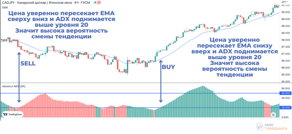 Гистограмма индикатора Advanced ADX пересекает отметку 20 снизу вверх.
