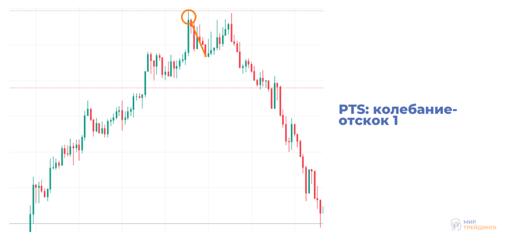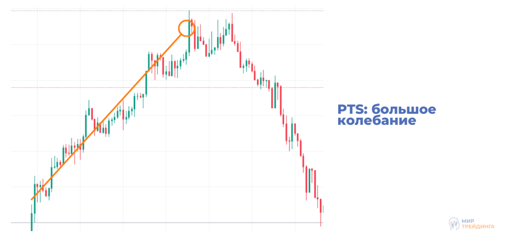 Первый шаг — большое колебание. Здесь мы ищем длинный устойчивый тренд, восходящий или нисходящий. Он может представлять собой одну линию или состоять из нескольких меньших колебаний в одном направлении. Конечная точка этого импульса является стартовой точкой для формирования сетапа распространения.