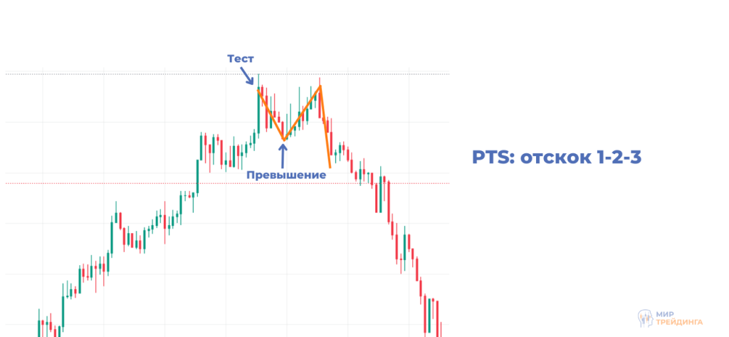 Третий шаг — вторая и третья коррекция. Ждем, когда цена пойдет назад в направлении основного тренда. Первая коррекция создает явление, называемое в волновой теории Гудмана — линия/тест/превышение.