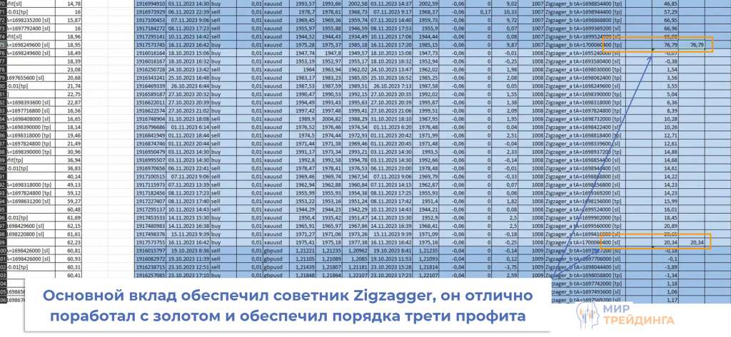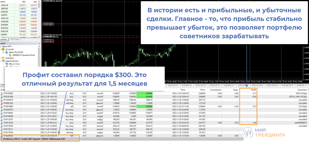 В результате видим, что основной вклад обеспечил робот Zigzagger, это трендовый алгоритм, он отлично отработал на XAUUSD. Если весь портфель принес профит в размере $300, то Zigzagger обеспечил примерно треть этой прибыли.