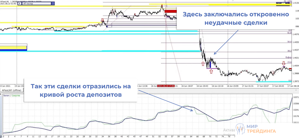 Значительная часть наставничества приходится на работу с тренажером. Он позволяет «торговать» на истории без правой части графика, что обеспечивает чистоту эксперимента. На тренажере отрабатываем сначала отдельные компоненты “Снайпера”, затем объединяем их в одно целое и снова торгуем в тренажере.