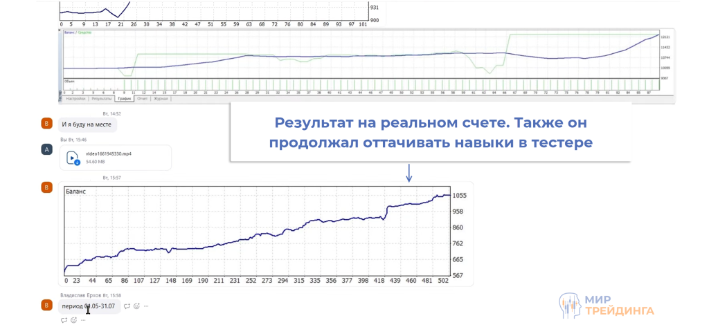 Вся эта история с момента знакомства и до выхода на результат заняла около 10-11 месяцев. Но это исключение из правил, форс-мажоры корректировали график занятий, это и повлияло на продолжительность. Срок наставничества зависит от трейдера, но обычно он в несколько раз меньше.