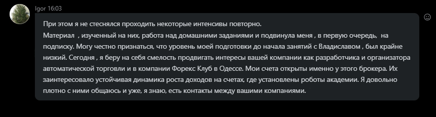 Хоть в процессе наставничества и возникали вопросы, у Игоря всегда была возможность задать их трейдеру-наставнику. Владислав не только помогал найти решение, но и предоставлял ссылки на полезные материалы, информация на которых позволяла более полно погрузится в тему и научиться решать возникающие проблемы самостоятельно.