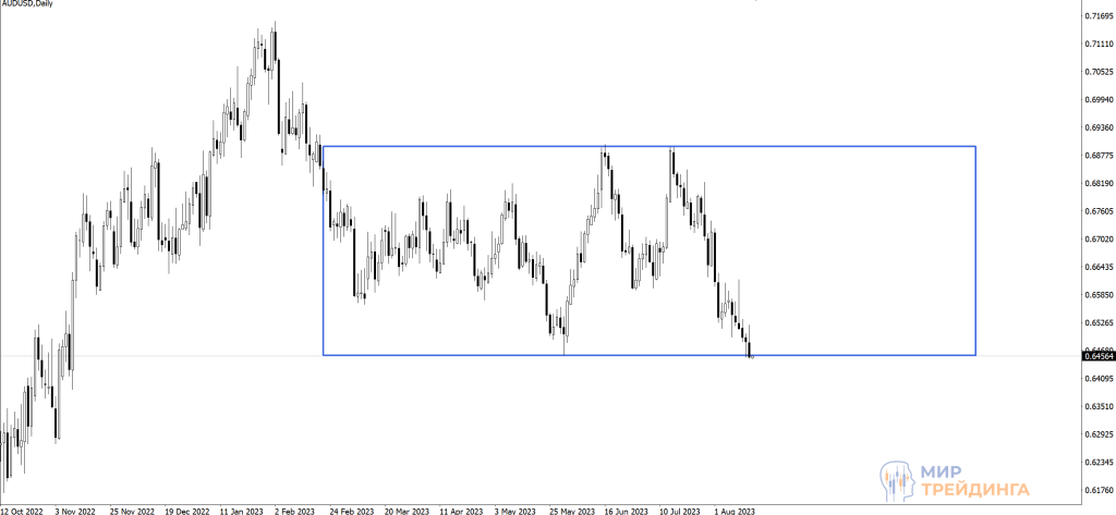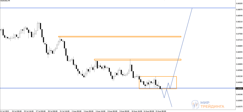 На дневном таймфрейме видно, что достигнута основная цель нисходящего движения. График находится непосредственно у нижней границы диапазона 0,6456-0,6895.
