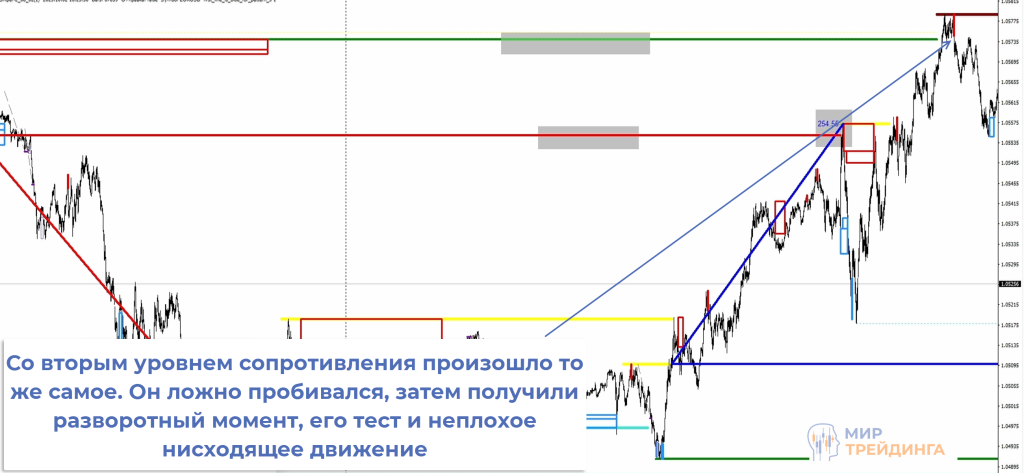 Первое сопротивление отработало практически идеально. Видно, что отскок от уровня завершился с небольшим забросом за уровень.