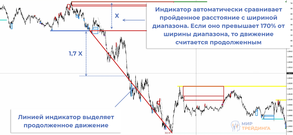 Для оценки является ли движение продолженным индикатор оценивает расстояние, пройденное графиком после выхода из диапазона. Если оно превышает 170% от ширины диапазона, то индикатор делает соответствующее построение. Это происходит без участия трейдера.
