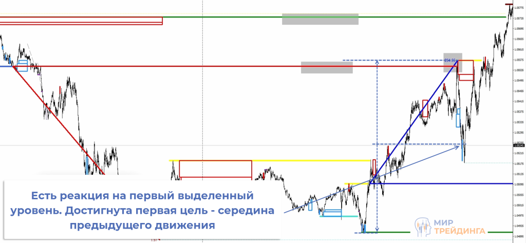 При подходе графика к одному из уровней нужно получить разворотный момент и его тест. Это дает точку входа для продаж. Основная цель по коротким позициям – уровень 50% предыдущего движения. Стоп выносится за максимум паттерна, при покупках – за минимум.
