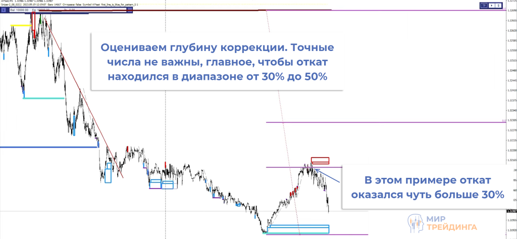 Оцениваем глубину коррекции. В примере она оказалась чуть больше 30% – то, что нужно, есть вероятность появления сигнала.
