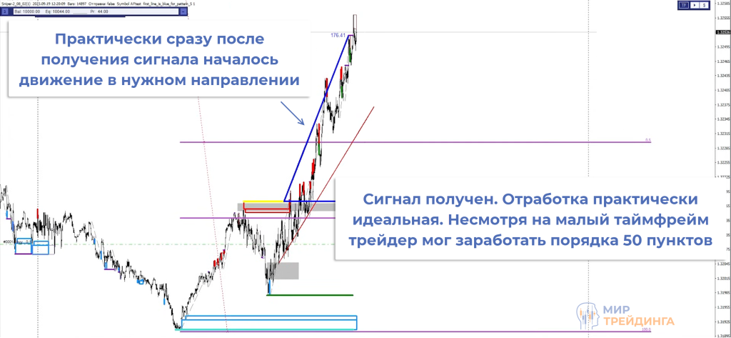 Если бы сделка была заключена в реальности, а не в тестере, то профит составил бы порядка 40-50 пунктов. Отдельно отмечу отработку сигнала, сразу же после входа в рынок началось движение в нужном направлении. Обычно так и отрабатывает алгоритм №4, если выполнены все условия, то график просто сразу идет в направлении тейк-профита.