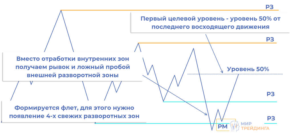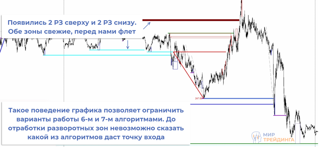 В примере после появления 4 разворотных зон мы уже знаем, что может возникнуть сигнал, соответствующий 6 алгоритму либо 7. Нужно следить за поведением графика.