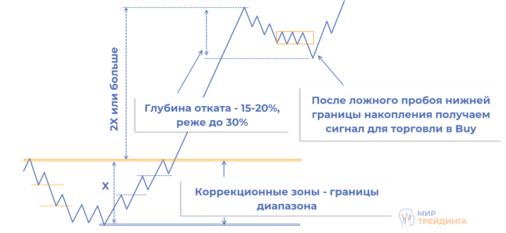 Точка входа формируется на окончании коррекционного движения. В этой области появляется проторговка, затем ложно пробивается ее нижняя граница и график импульсом возвращается в область над накоплением. Это подтверждает бычий настрой рынка и дает сигнал для покупок. Медвежий паттерн выглядит зеркально, логика не меняется.