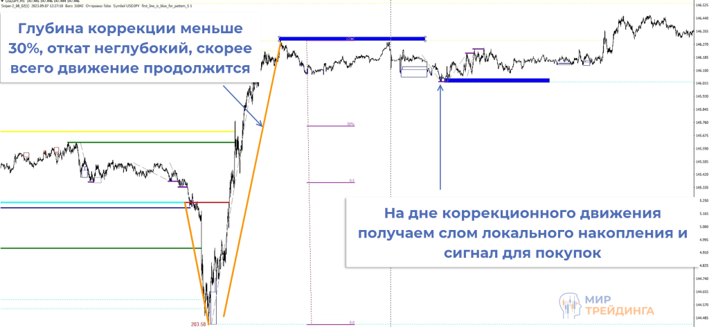 При определении глубины коррекции оцениваем все движение, а не его часть после пробоя соответствующей коррекционной зоны.