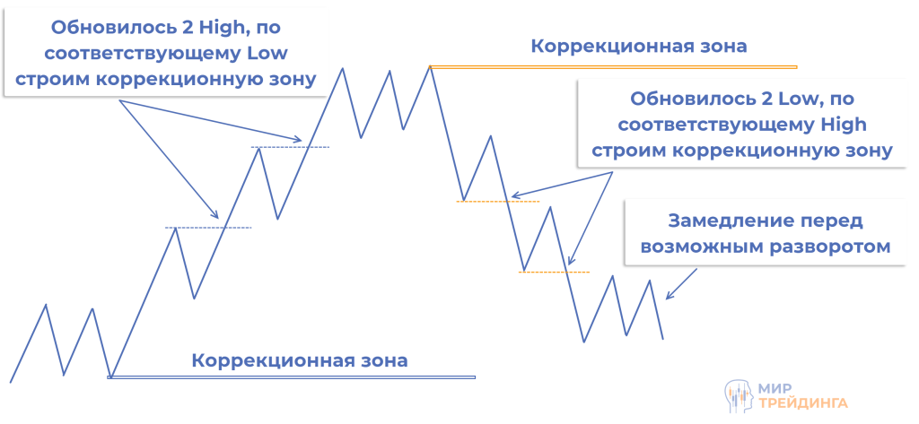 Для начала вернемся к уже пройденному материалу и вспомним принцип формирования тенденции и ее слома, также затронем коррекционные зоны. Это важно для понимания принципа работы алгоритма №3.