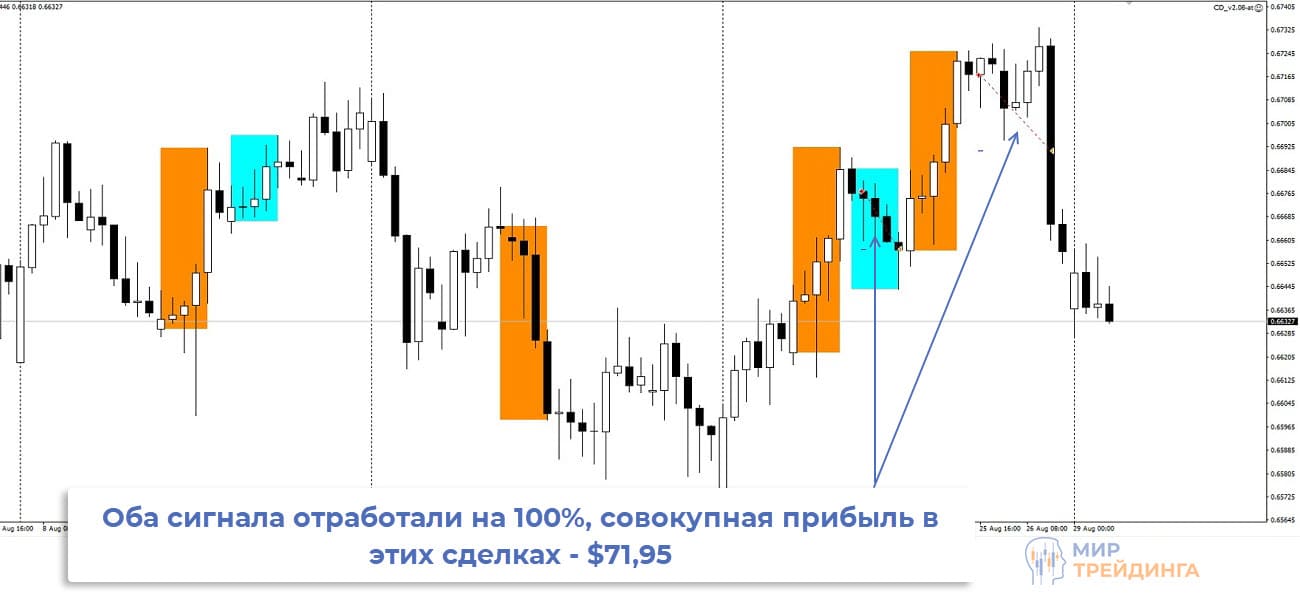 По NZDCHF откатные свечи, ломающие тренд, были больше чем по AUDCHF. Да и величина самого тренда меньше, чем в случае с AUDCHF. Поэтому для реализации небольших тейков нужно было меньше времени, отработка сигналов произошла в течение нескольких часов.