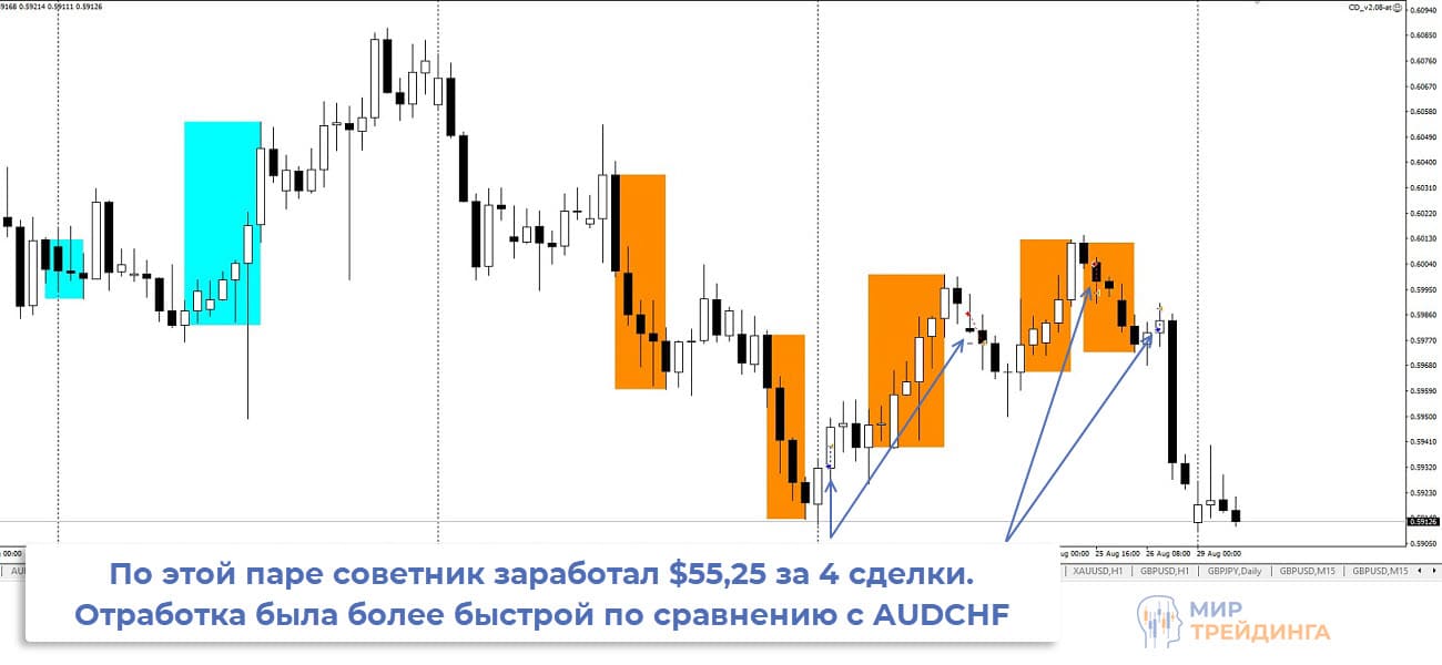 На AUDCHF было заключено 2 сделки. Отработка первой заняла 12,5 часов, второй – 25,5 часов.