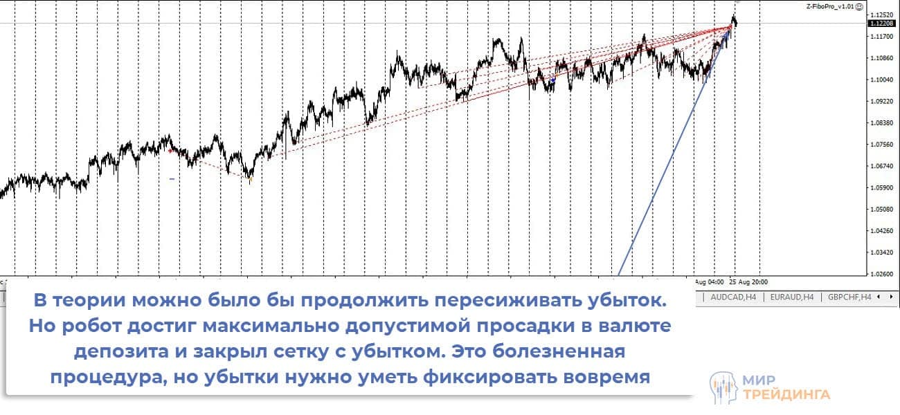 В итоге у некоторых брокеров сработало аварийное закрытие и робот закрыл с убытком сетку Sell ордеров. Это произошло не у всех, выше показан худший сценарий, когда Z-Fibo Pro был вынужден зафиксировать убыток.