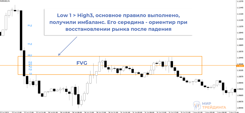 разрыв справедливой стоимости – уровень 50% зоны имбаланса. Это ориентир при восстановлении после импульса. Обычно резкие движения компенсируются, как минимум частично. FVG дает четкий ориентир для возможной фиксации профита.