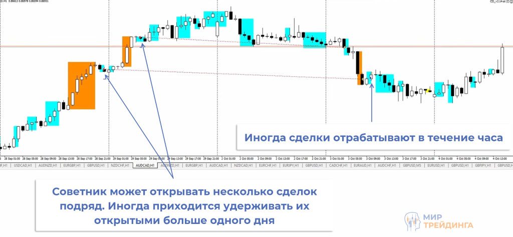 Сроки отработки сделок разнятся. Иногда цена сразу идет в нужном направлении, и сделка закрывается в течение часа. Не исключено, что график продолжит движение в направлении импульса, сделка уйдет в просадку, это нормальное явление. Если в этот момент появится сигнал, то советник откроет еще одну сделку.