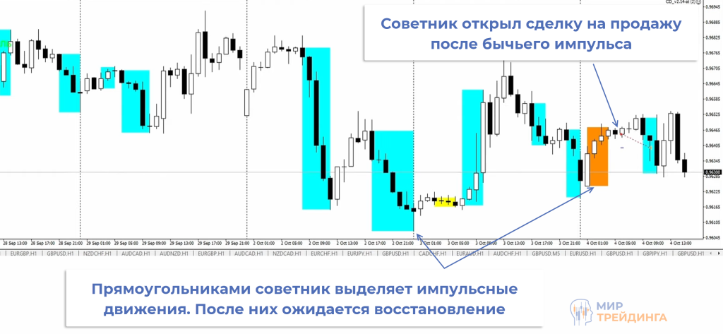 В роботе CD используется похожая логика. Он определяет импульсы как последовательность свечей одного цвета. Его окончанием считается появление свечи противоположного цвета. В этот момент советник открывает сделку в расчете на коррекцию.