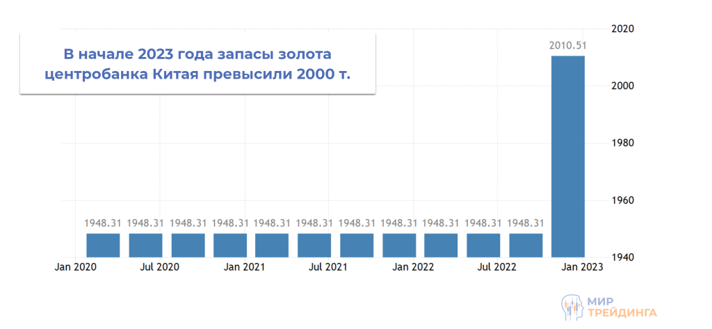 Один из самых активных покупателей – Китай. По состоянию на начало 2023 г. регулятор отчитался о росте запасов до 2010,51 т. К началу марта объем золота в хранилищах достиг отметки в 2070 т.