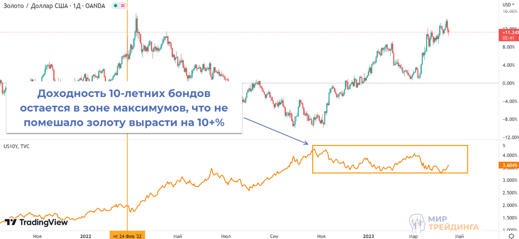 Из-за нестандартных рыночных условий сейчас эта связь нарушена. Доходность гособлигаций США растет, но золото не падает, оставаясь в зоне максимумов.