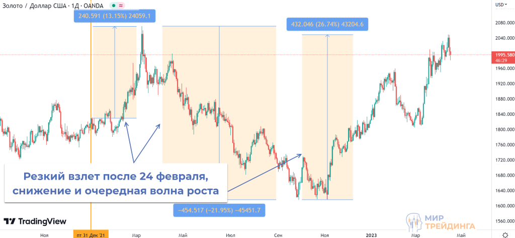 После февраля 2022 г. рост золота ускорился. В моменте график XAUUSD тестировал сопротивление на отметке 2070,00. Затем был спад, возврат к поддержке в районе 1600,00 и продолжение роста. В итоге к середине весны 2023 г. драгметалл вернулся к области исторических максимумов.