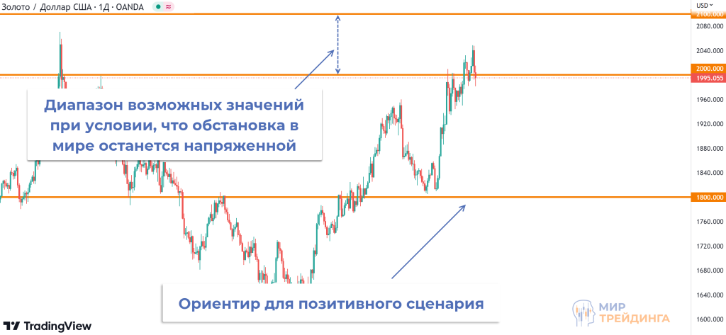 Если текущая неопределенность сохранится, то вероятнее всего котировки XAUUSD останутся в диапазоне $2000-$2100 за унцию. Баланс спроса и предложения не позволит драгоценному металлу сильно просесть в цене. Рассчитывать на сильный рост XAUUSD также не стоит, актив уже в области исторических максимумов, уровень $2100 несколько раз выступал в роли непреодолимого препятствия.