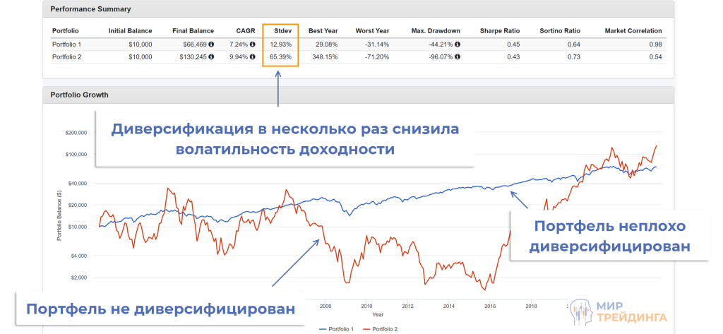 Доходность плохо диверсифицированного портфеля напоминает американские горки. В один год его стоимость может взлететь на 100%, но уже через год портфель уйдет в глубокую просадку и потеряет 70-80% стоимости. В этом и заключается смысл диверсификации в инвестировании – мы сглаживаем эти пики, делая кривую роста капитала более плавной.