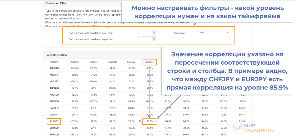 С трейдингом на Foreign Exchange Market все проще – достаточно оценить корреляцию валютных пар и отобрать те, по которым она в пределах от -50% ... -60% до 50% ... 60%. Для оценки этого показателя можно использовать индикаторы, но есть и готовые таблицы, например, на myfxbook.com.