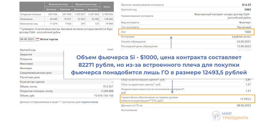 профит по сделке – разница между ценой покупки и продажи фьючерса. В примере она составила бы 81794 – 81628 = 166 рублей. Если бы было куплено 10 контрактов, то профит составил бы 1660 рублей, а ГО – 122442 рубля.