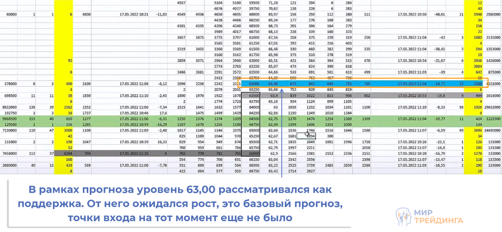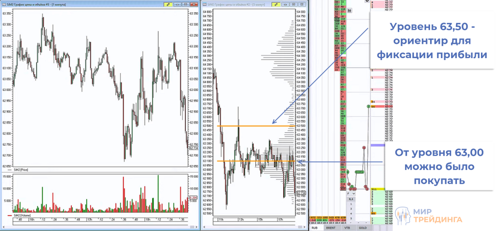 На графике в момент тестирования уровня 63,00 формировались условия для покупок, подтверждение этого видели и в стакане. На 63,50 (еще один уровень из базового прогноза) можно было фиксировать профит.