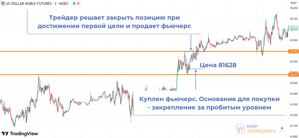 на первом целевом уровне (недавний пробойный максимум) фиксируется прибыль;