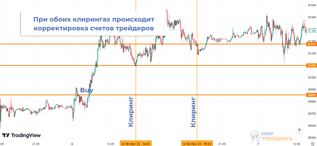Клиринг – операция, фиксирующая промежуточный/окончательный результат. На Московской бирже проводятся в диапазоне 14:00-14:05 МСК и в 19:00 МСК. Если актив торгуется на вечерней сессии, она идет до 23:50 МСК, то корректировка баланса счетов происходит уже в утренник клиринг.