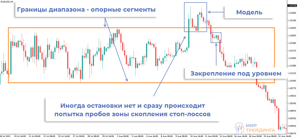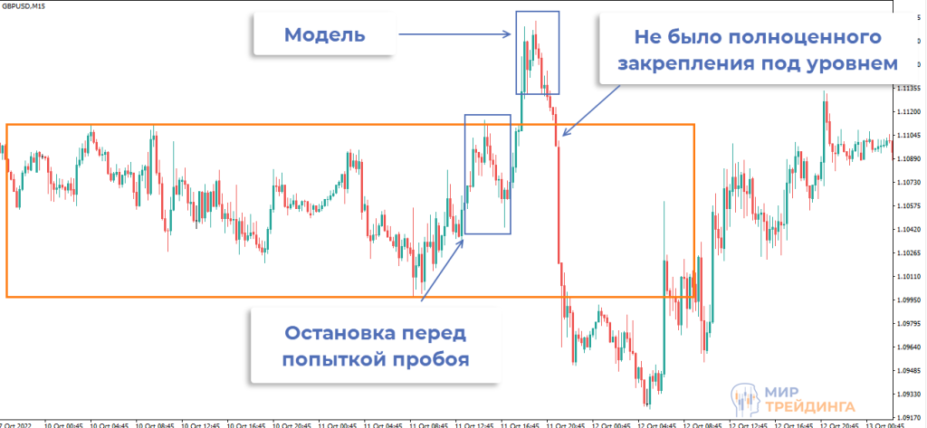 Встречаются паттерны, в которых нет непосредственно закрепления после возврата в область за уровнем. Если торгуете исключительно по логике стандартных ГУД, то такие точки входа не сможете брать в работу.