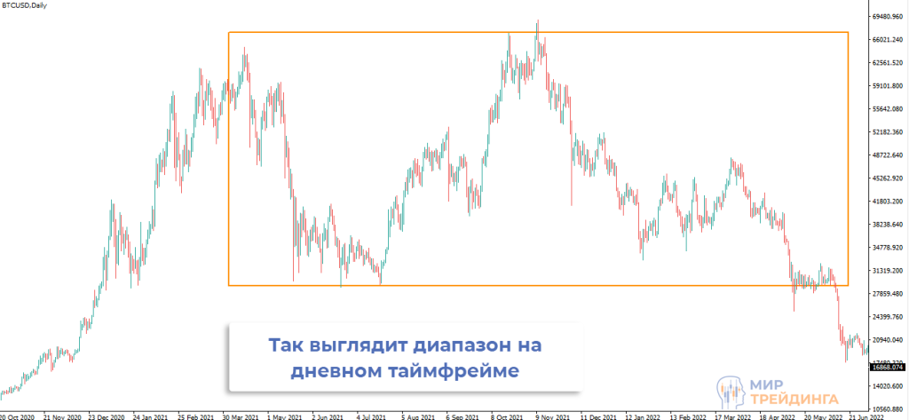 Показателен пример одной из сделок по BTCUSD. На дневном графике сформировался стандартный диапазон.