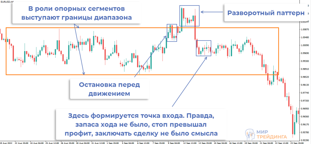 В примере с EURUSD ровно тот же принцип отработал при движении графика в диапазоне. В роли опорного сегмента выступала граница зоны. Ложный пробой с М-образной фигурой подсказал о готовящемся возврате под сопротивление.