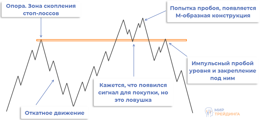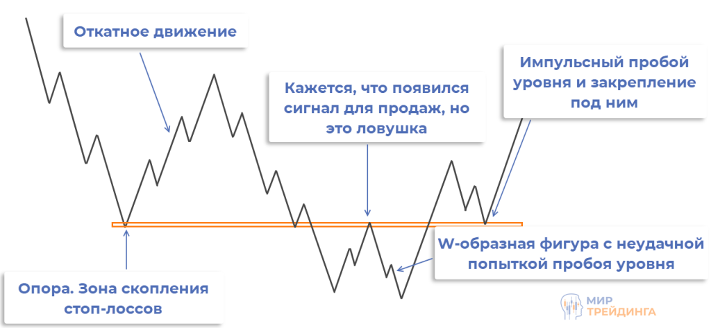 Этот паттерн легко определять на графике по опорному сегменту и М-, W-образной конструкции в момент попытки пробоя уровня сопротивления/поддержки. Это характерные маркеры, по которым можно быстро определять наличие паттерна.