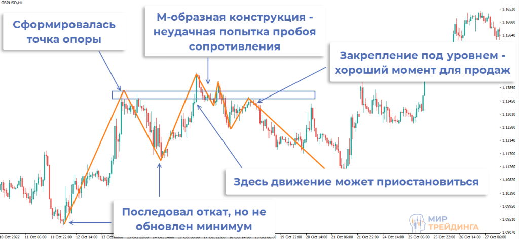 На реальном графике повторяется та же логика, что и в схемах выше. Разве что фигуры M и W могут быть деформированы. Не всегда паттерны выглядят так же идеально, как их показывают на схемах.