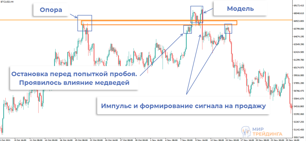 попытка продолжения восходящего движения завершается неудачей. Тестируется ближайший high, затем импульсом график «ныряет» под уровень;