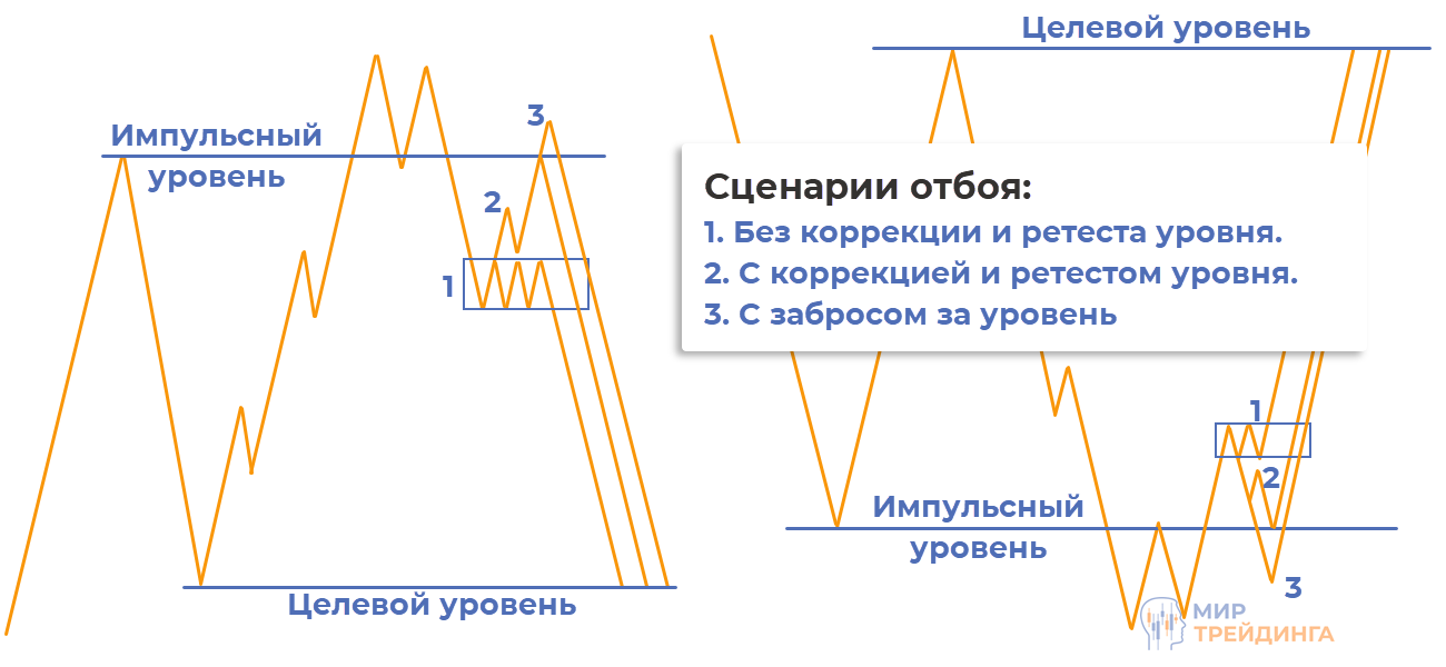 Не всегда в таких ситуациях формируется идеальный паттерн с четким ретестом основания разворотной фигуры. Коррекции может и не быть. Вместо этого появляется локальное накопление и затем продолжается движение в нужном направлении. Как вариант – возможен ретест с забросом графика за уровень.