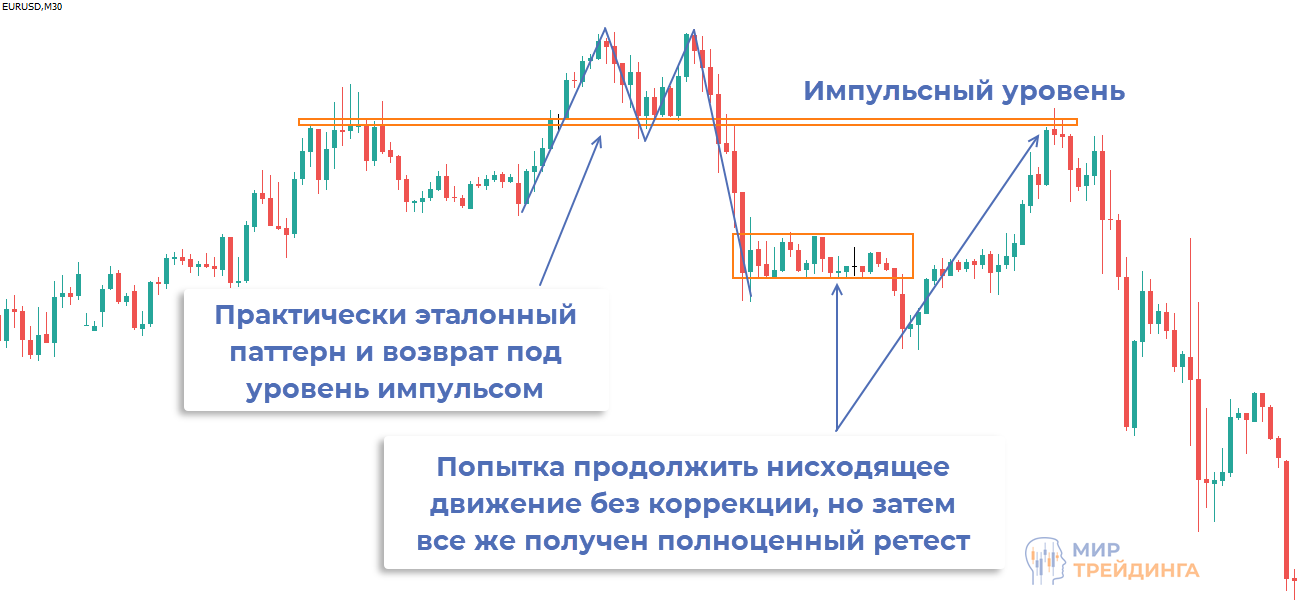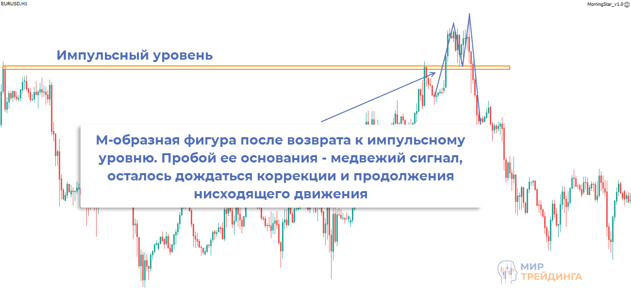 в примере ниже импульсный уровень пробивался, но затем быки столкнулись со сложностями и не смогли обеспечить продолжение роста. Основание М-образной фигуры совпало с импульсным уровнем сопротивления. После пробоя этой поддержки и завершения коррекции получаем точку входа на продажу. Точки входа этого типа – распространенный сигнал в Снайпере,