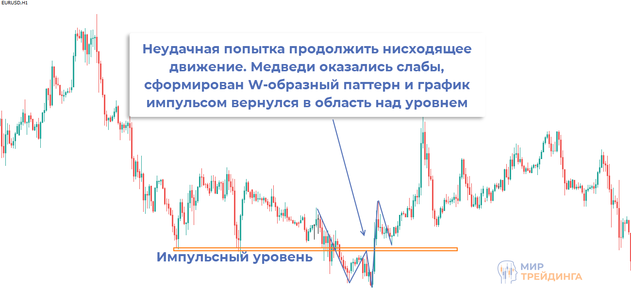 - затем график возвращается к нему, но не может продолжить движение. Формируется характерная фигура в виде М (медвежий паттерн) либо W (бычья конструкция);