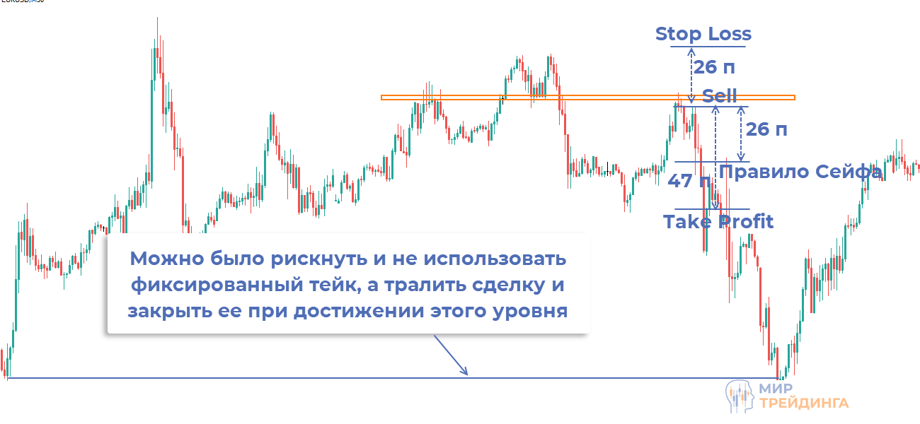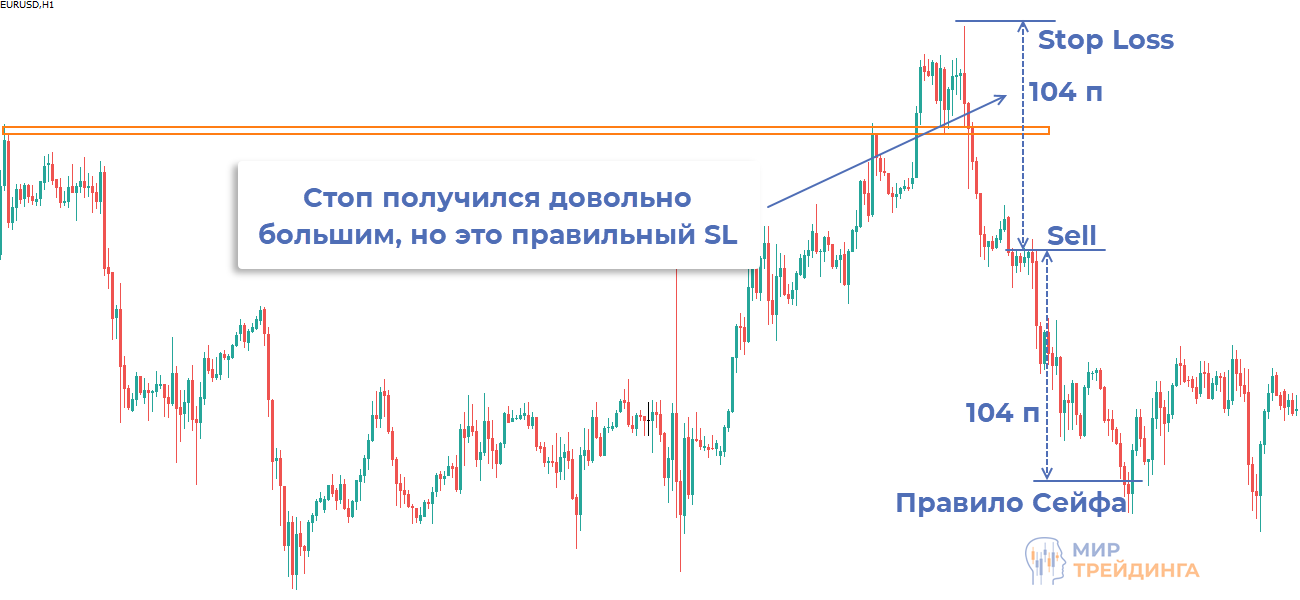в момент входа стоп оказался очень большим, но это правильно выставленный SL. Несмотря на это у трейдера был шанс выполнить правило Сейфа. Позиция становилась безрисковой, далее начался флет и остаток скорее всего был бы закрыт вручную с прибылью в 100+ пунктов;