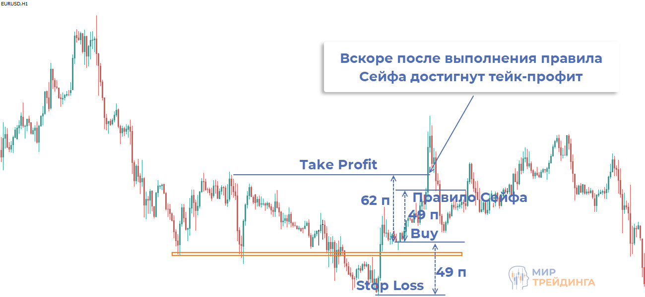- при сопровождении позиции используется правило Сейфа. Когда график пройдет в нужном направлении расстояние, равное стоп-лоссу, закрывается 50% от объема позиции. Для удобства входите в рынок 2 сделками равного объема и ставьте для них разные тейки. При выполнении правила Сейфа стоп по оставшейся части переносится на уровень открытия сделки.