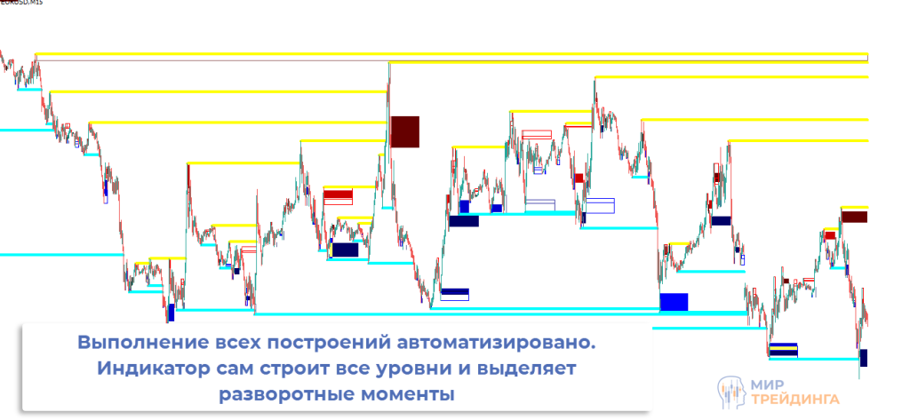 Идею автоматизации построений предложили те, кто обучался торговле по ТС “Снайпер”. Это должно было гарантировать отсутствие разночтений. При ручной разметке фактор субъективизма все же присутствует. Но, если делегировать эту задачу индикатору, то у всех гарантированно будет одна и та же картина происходящего, одни и те же точки входа.