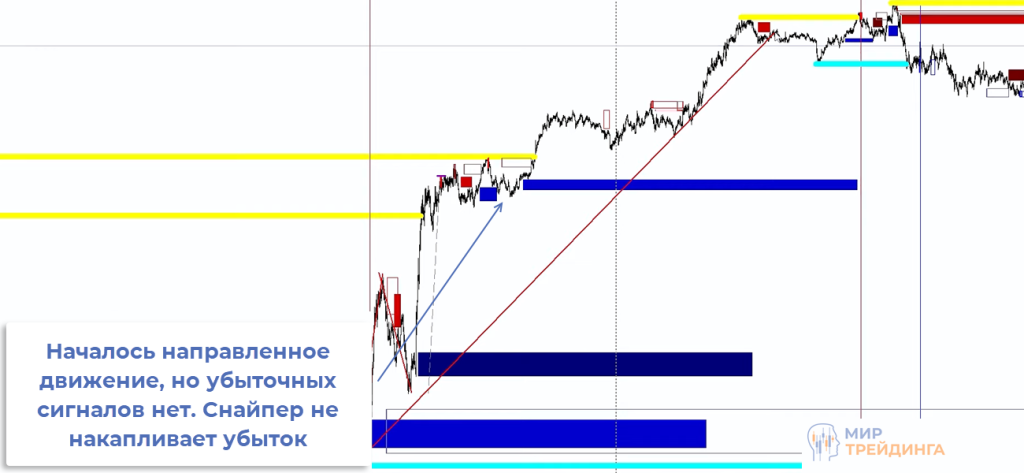 Снайпер подходит для обеих фаз, есть соответствующие алгоритмы (всего их 7) и на случай продолженного движения, и для работы во флете. У индикатора нет явного крена в сторону тренда либо работы в рамках трендов. Когда начинается продолженное движение он не генерирует серию убыточных разворотных сигналов.