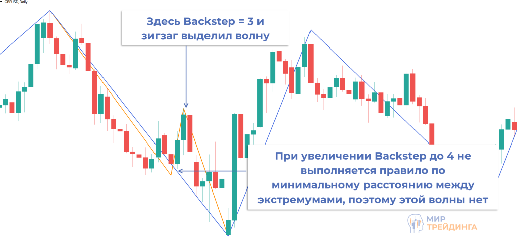 - Backstep. Выраженное в количестве свечей расстояние, которое разделяет однотипные экстремумы. Проще говоря, это расстояние между двумя минимумами или же двумя максимумами. Позволяет избежать постоянной перерисовки экстремумов и чрезмерной частоты изменения направления линий.