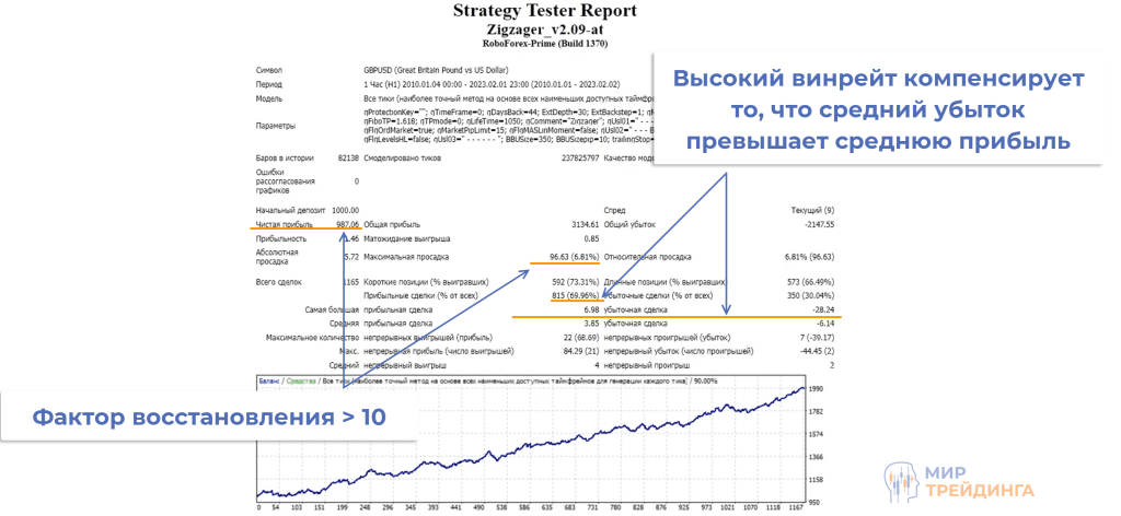 - высокий винрейт – порядка 70%. Это компенсирует то, что средний убыток превышает средний профит;