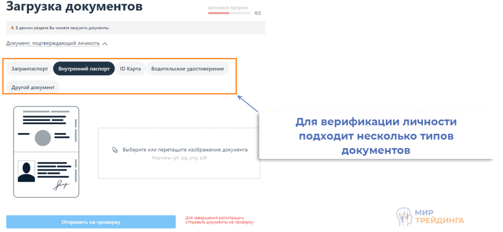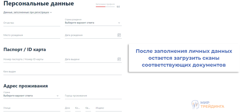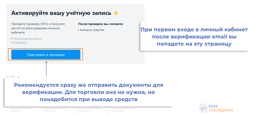 после входа в личный кабинет трейдер попадает на страницу с предложением пройти верификацию. Желательно сделать это сразу, так как верификация – необходимое условие для вывода денег;