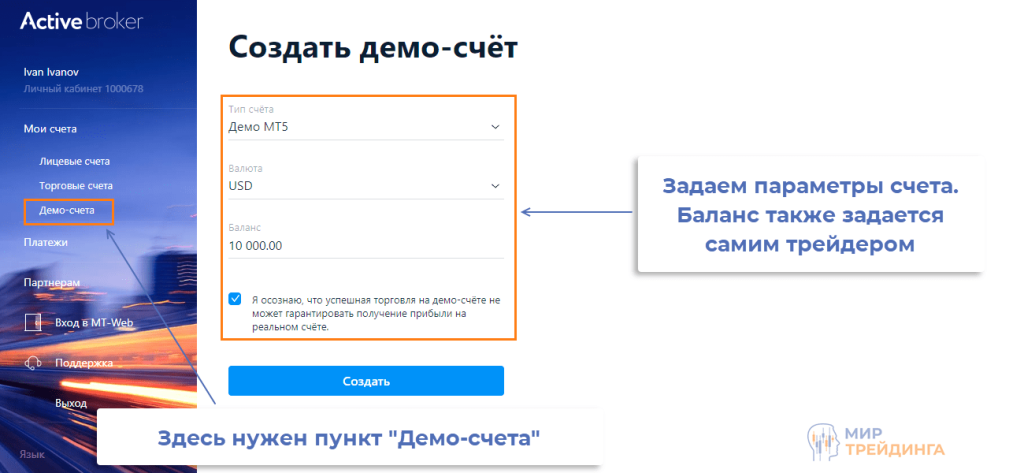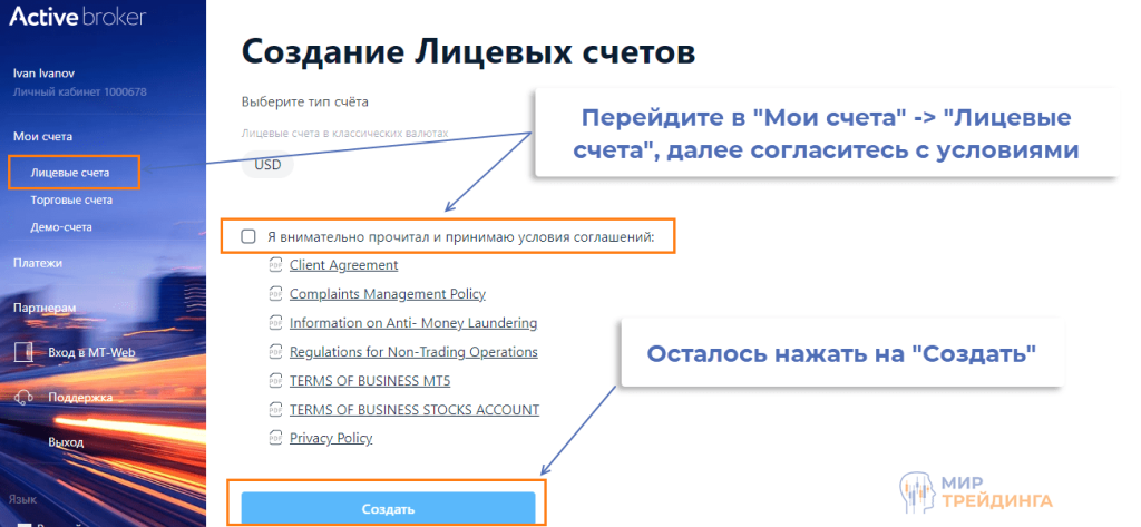 Регистрацию можно условно разделить на 2 этапа – сначала создается учетная запись на сайте Active Broker, потом вручную создается лицевой и торговый счета. Лицевой нужен для пополнения, а торговый – для заключения сделок в МетаТрейдере.